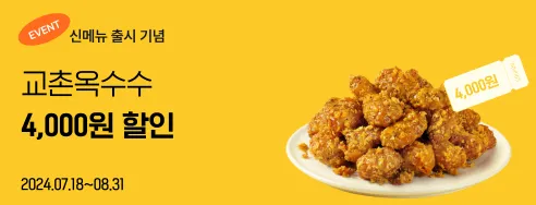 신메뉴 교촌옥수수 출시 기념으로 7/18(목)~8/31(토) 기간 동안 4천 원 할인한다고 해요. 저렴하게 맛볼 수 있는 기회이니 신메뉴 궁금하셨던 분들은 드셔보시면 좋을 것 같습니다. 그리고 교촌치킨 어플 회원이라면 10% 할인받을 수 있더라고요. 교촌치킨이 집 근처에 있다면 포장해 오는 것도 좋은 방법인 것 같습니다.