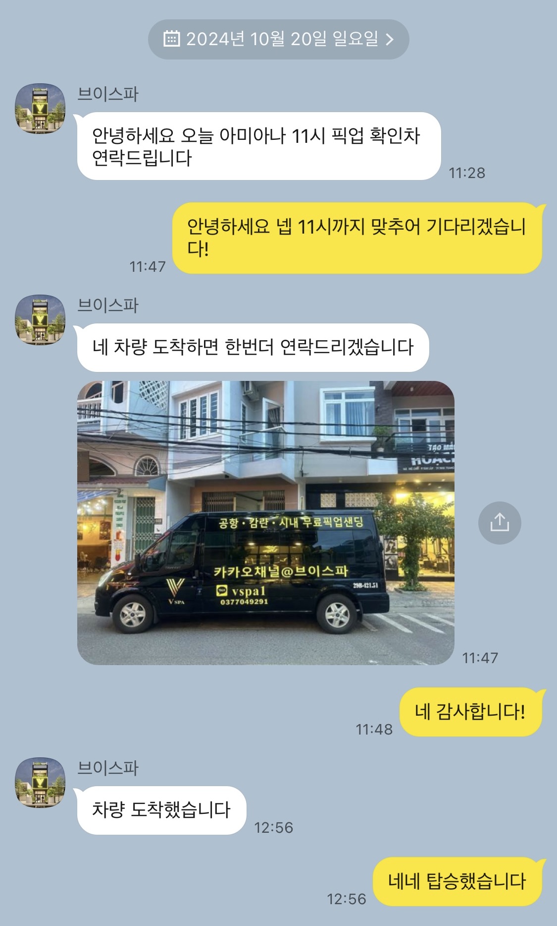 아미아나리조트 체크아웃 시간에 맞춰 11시 픽업으로 요청드렸어요. 채팅내용을 한국에서 캡쳐한거여서 시간차이가 있을 수 있습니다. 로비에서 대기하는데 브이스파 차량이 보여서 탑승했고 픽업시간보다 10~20분정도 미리 오셔서 일찍 출발할 수 있었어요.