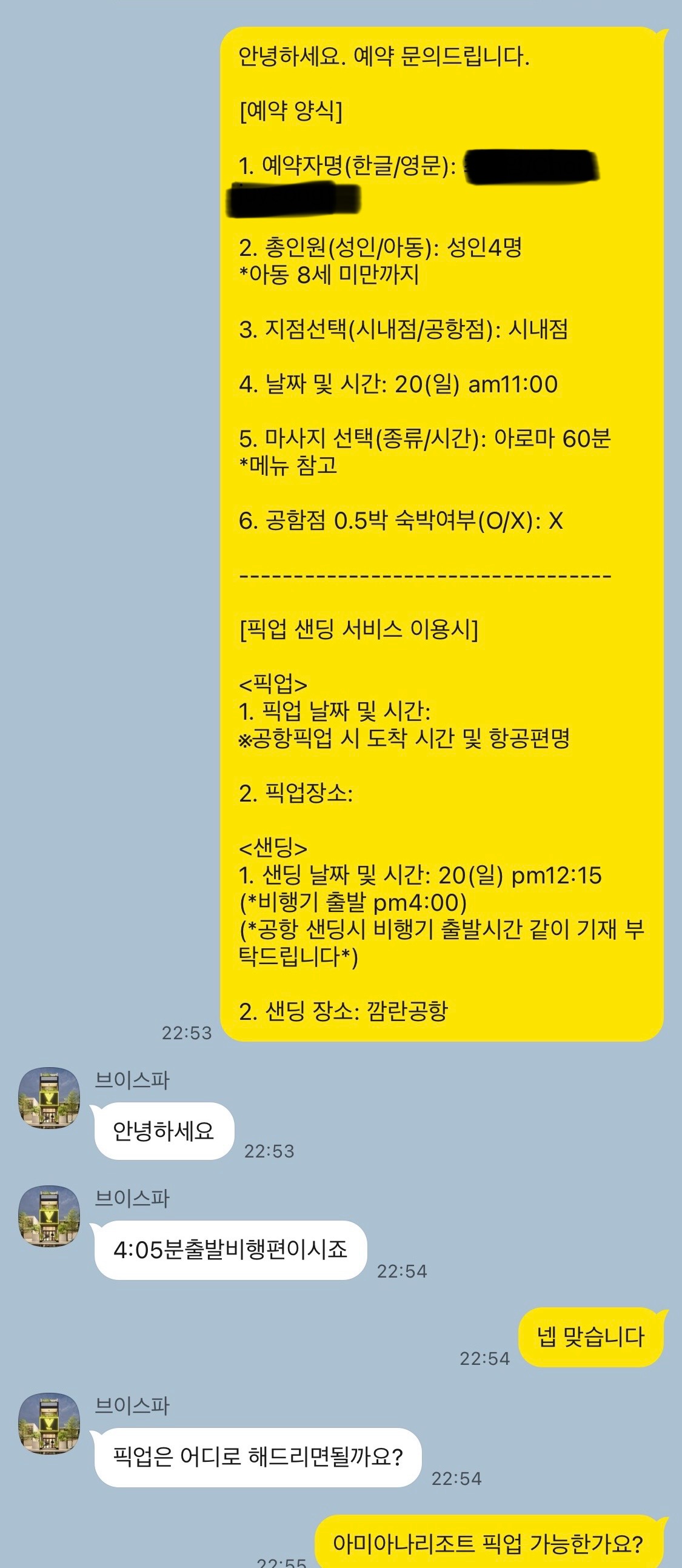예약정보에 추가로 저희는 픽업 샌딩 서비스도 이용할 예정이라 묵고 있는 리조트와 항공편 정보도 같이 보냈어요.