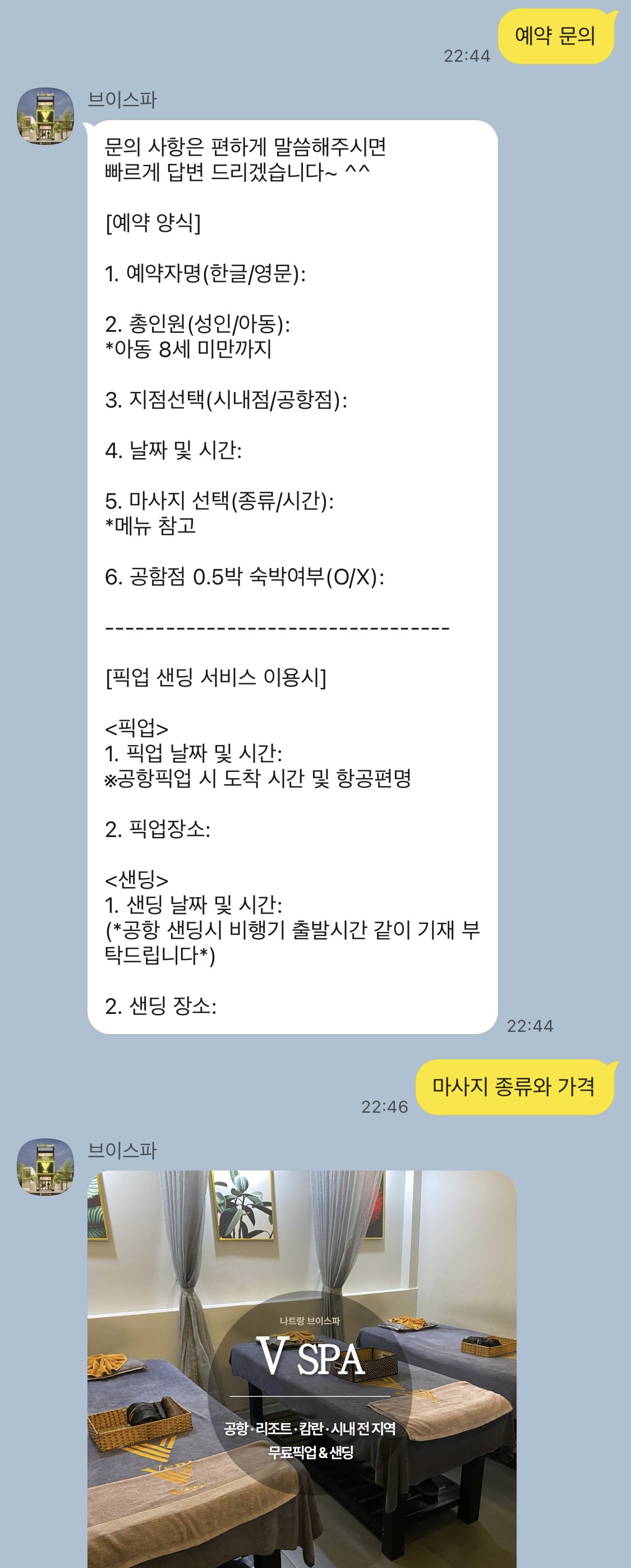 마사지 이후에 바로 공항으로 가야해서 가능하면 무료 픽업되는곳으로 알아보았어요. 무료픽업샌딩이 되고 시내에서 유명한 브이스파로 예약하게 되었구요.