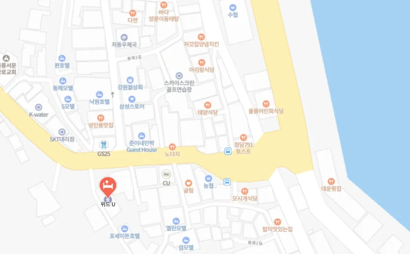 저동항에서 걸어서 10분, 차로 2분정도 걸리는 숙소에요. 위드유 말고 또 저동항과 가까웠던 곳이 1,2번으로 소개드렸던 곳인데요. 위드유가 가격이 비싸도 마음에 들었던 이유는 바로 앞에 편의점이 있고 식당이 10개 이상 있다는 점이에요. 편의시설이 너무 좋았기에 예약할 때 고민이 되더라구요.
